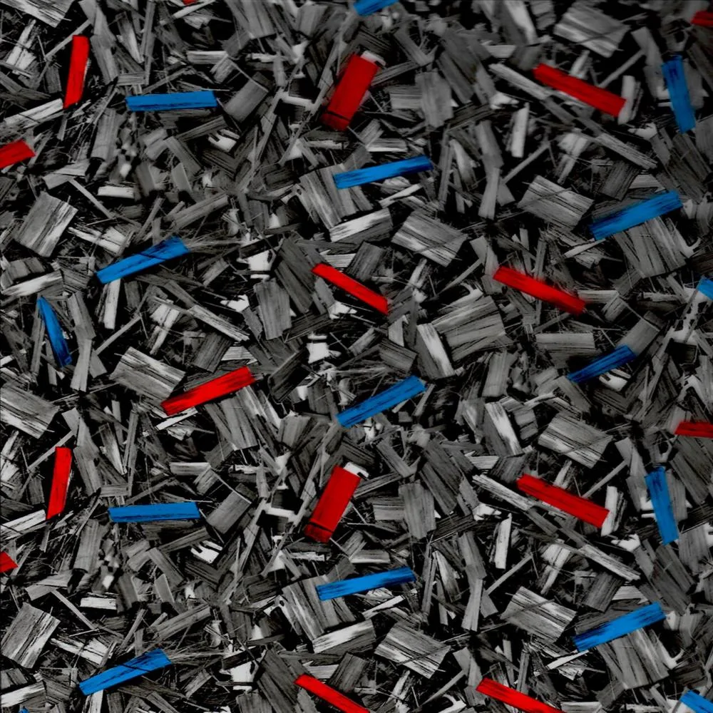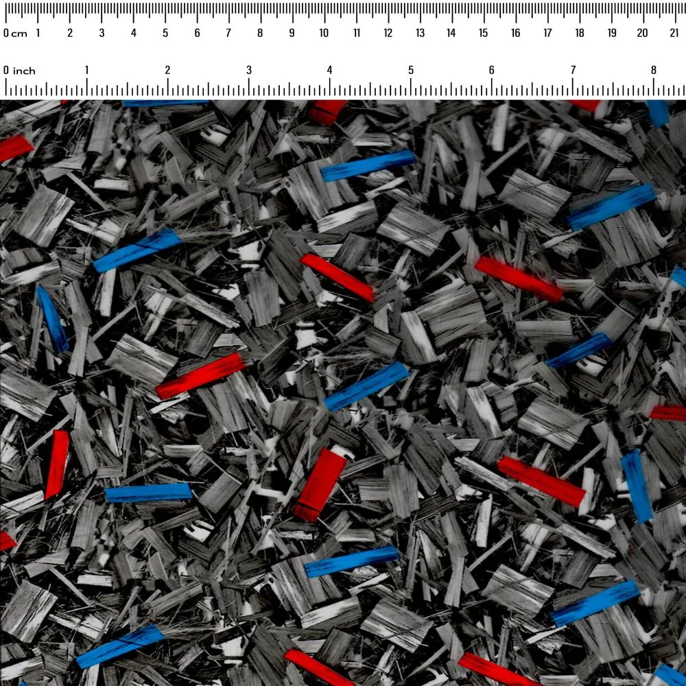 A forged carbon hydrographic film enriched with vibrant red and blue shards. This dynamic pattern blends industrial strength with vivid color, creating a striking visual effect that's perfect for adding a modern and energetic touch to your projects.