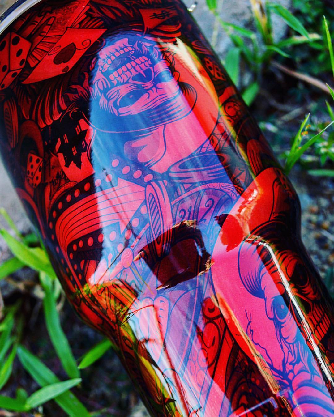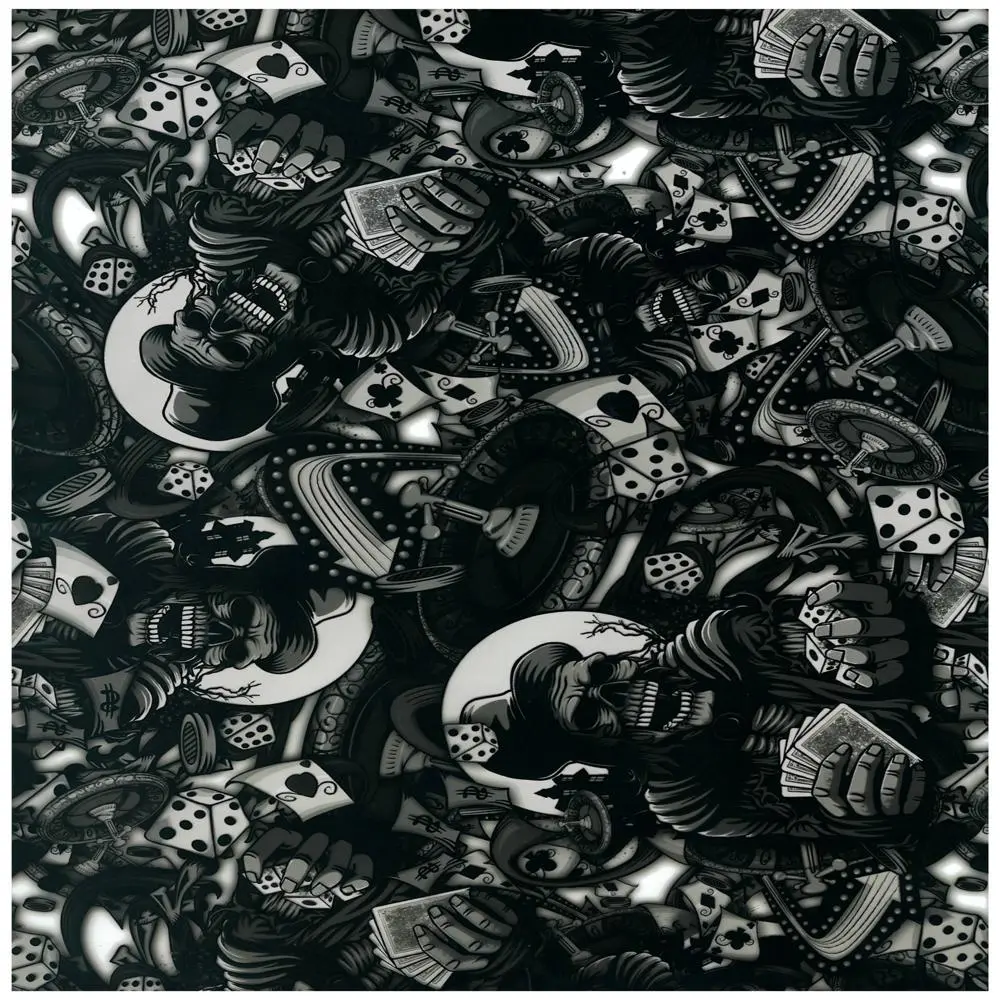SAD-703 (50cm) - Evil Casino - This pattern is excellent to work with and gives great detail to anything that it is put on. The Evil Casino pattern gives you a Vegas themed pattern with a little skull twist. With roulette tables, dice, skulls and much more in this detailed pattern, it will look great under any base coat. This film is a black and clear so any basecoat can be used.