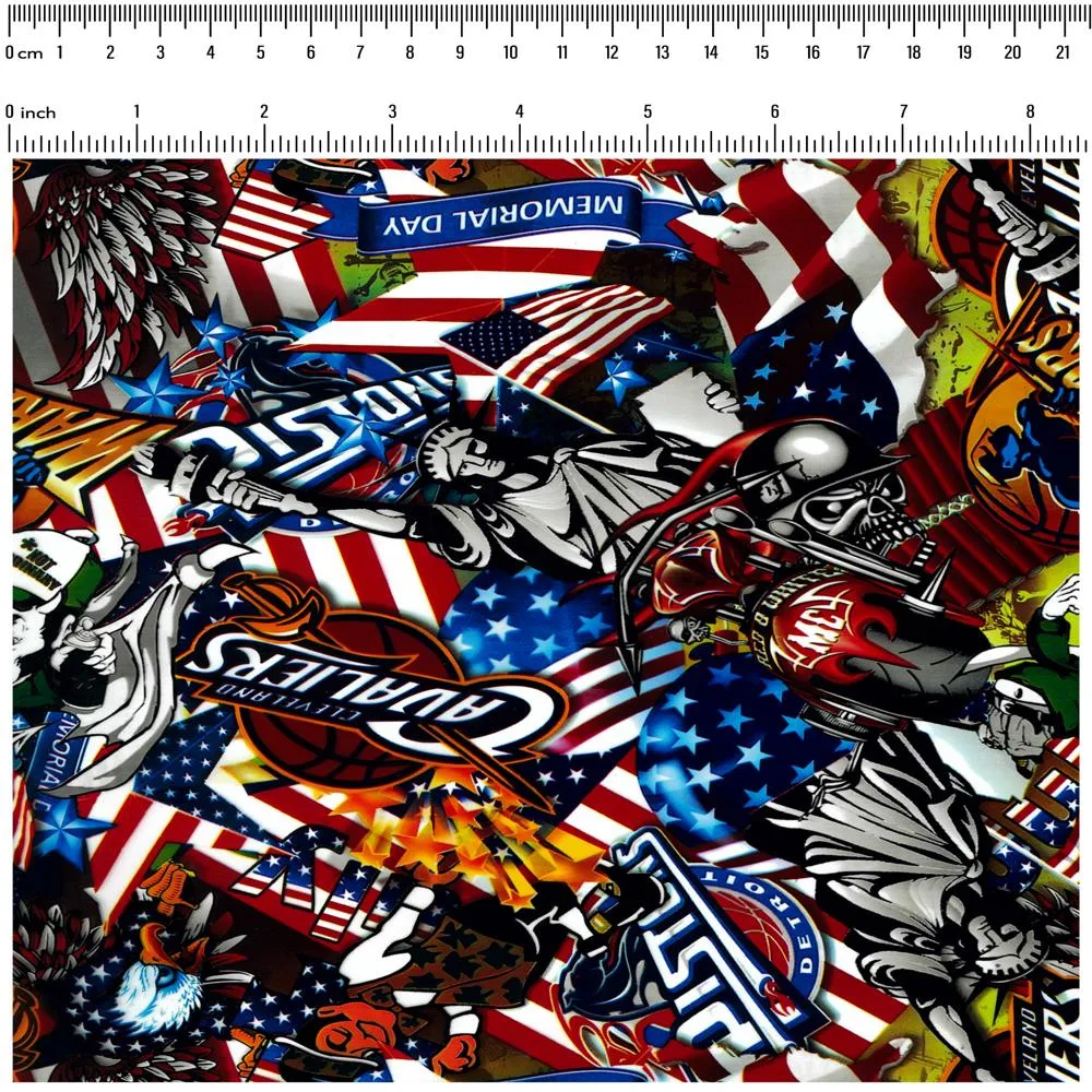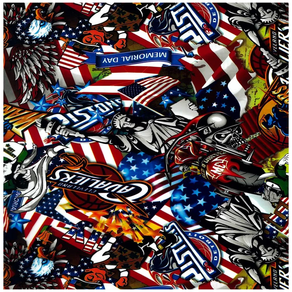 This vibrant design blends a variety of iconic imagery, from the Statue of Liberty and flowing stars and stripes to striking graphics, flames, and tributes to Memorial Day. Featuring a dynamic mix of patriotic symbols, sports emblems, and detailed illustrations, this film is perfect for those who want a truly unique and statement-making design. Best applied over a white or light base to enhance its vivid colors and intricate details!